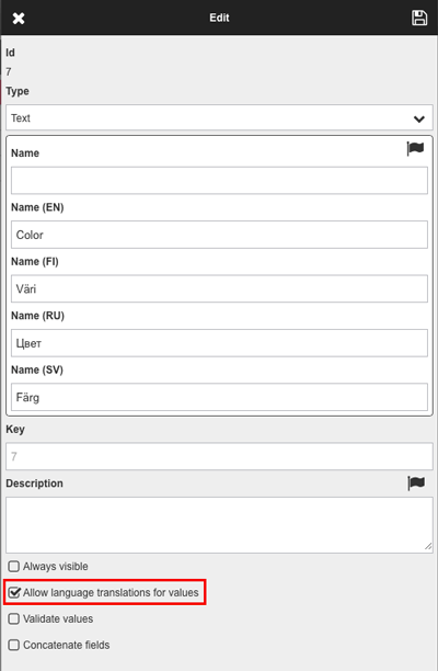 You can set your own language translations for the values of the property fields by checking the box “Allow language traslations for values”. In the example “Color” property field.