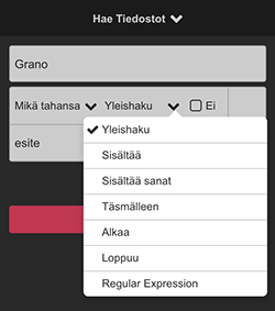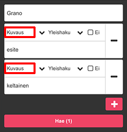 Jos allekkain on eri hakuperusteita (nimi, kuvaus, avainsana) ne ovat keskenään JA suhteessa. Jos samassa tekstikentässä on useita merkkijonoja, ne ovat keskenään JA suhteessa.
