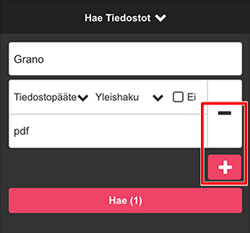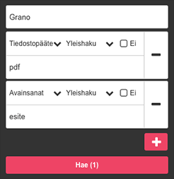Tarkennetulla haulla voit hakea täsmälleen määritellystä luokituskentästä tai yhdistellä useita eri hakukenttiä. Hakukenttiä voi lisätä ”Plus” painikkeesta (+) ja poistaa ”Miinus” painikkeesta (-).