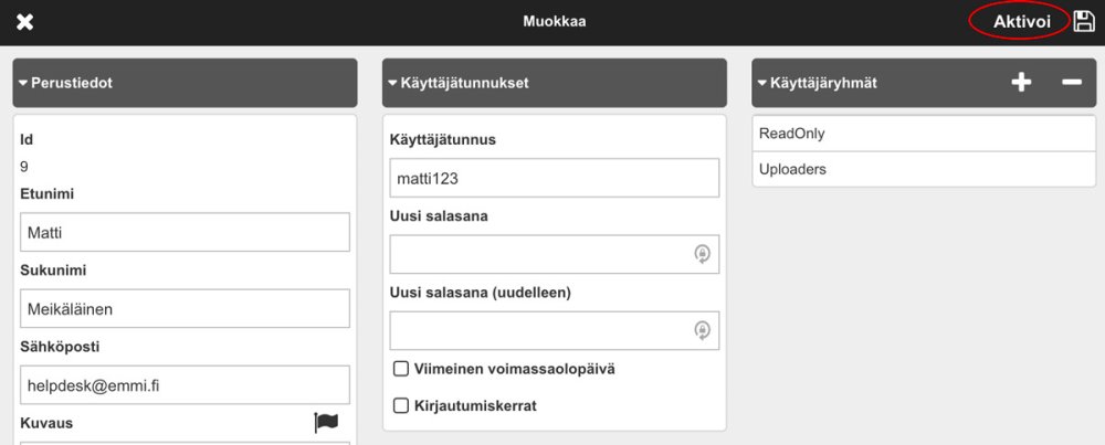 Tarkista käyttäjätunnuksen tiedot ja ryhmät ja hyväksy käyttäjätunnus painamalla oikeasta yläkulmasta “Aktivoi”.