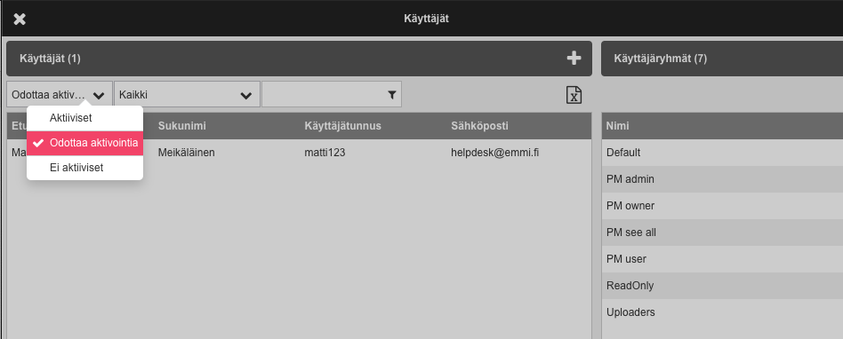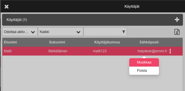 Voit muokata ja tarkistaa tunnuksen tietoja aktivoinnin jälkeen, kun vaihdat suodattimen “Aktiiviset” tunnukset näkymään ja haet kyseisen käyttäjän.