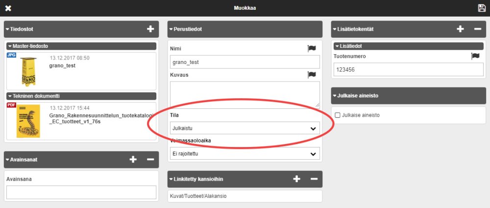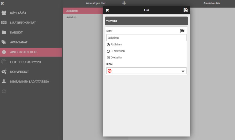 Aineistojen tila tulee näkyviin muokkauksessa alasvetovalikkona.