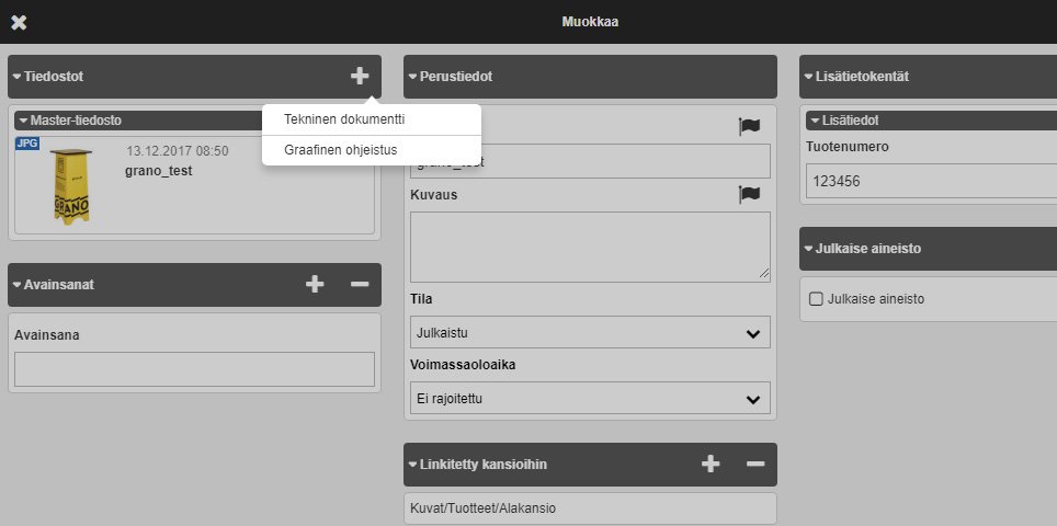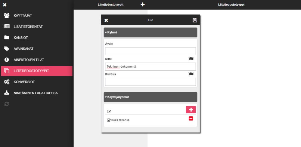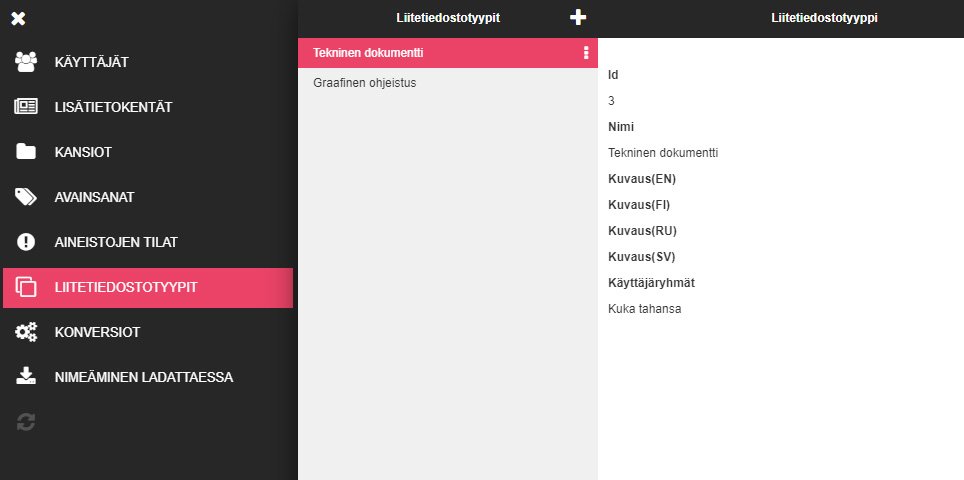 Tämän jälkeen aineiston muokkausnäkymässä nähdään tiedostotyypit seuraavasti: