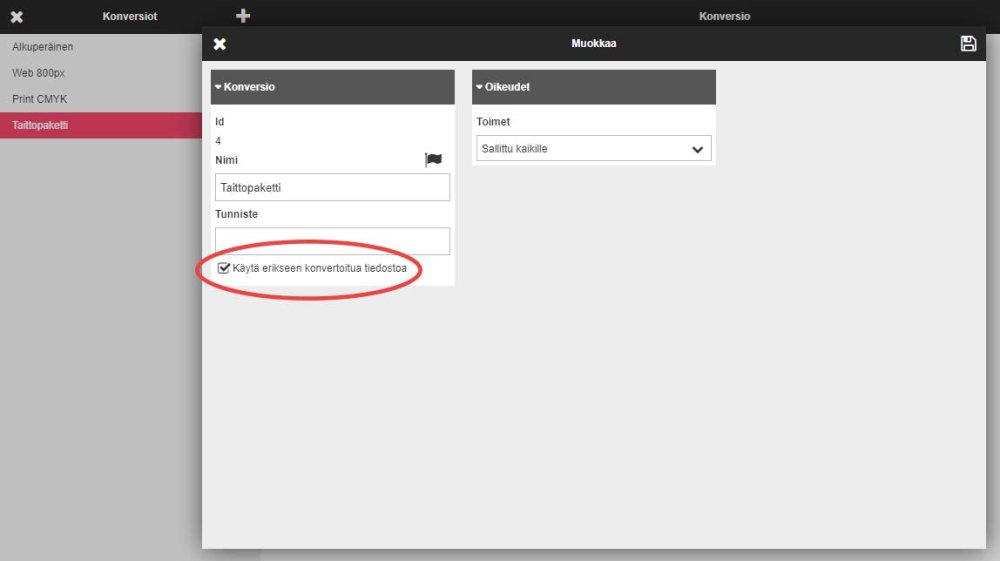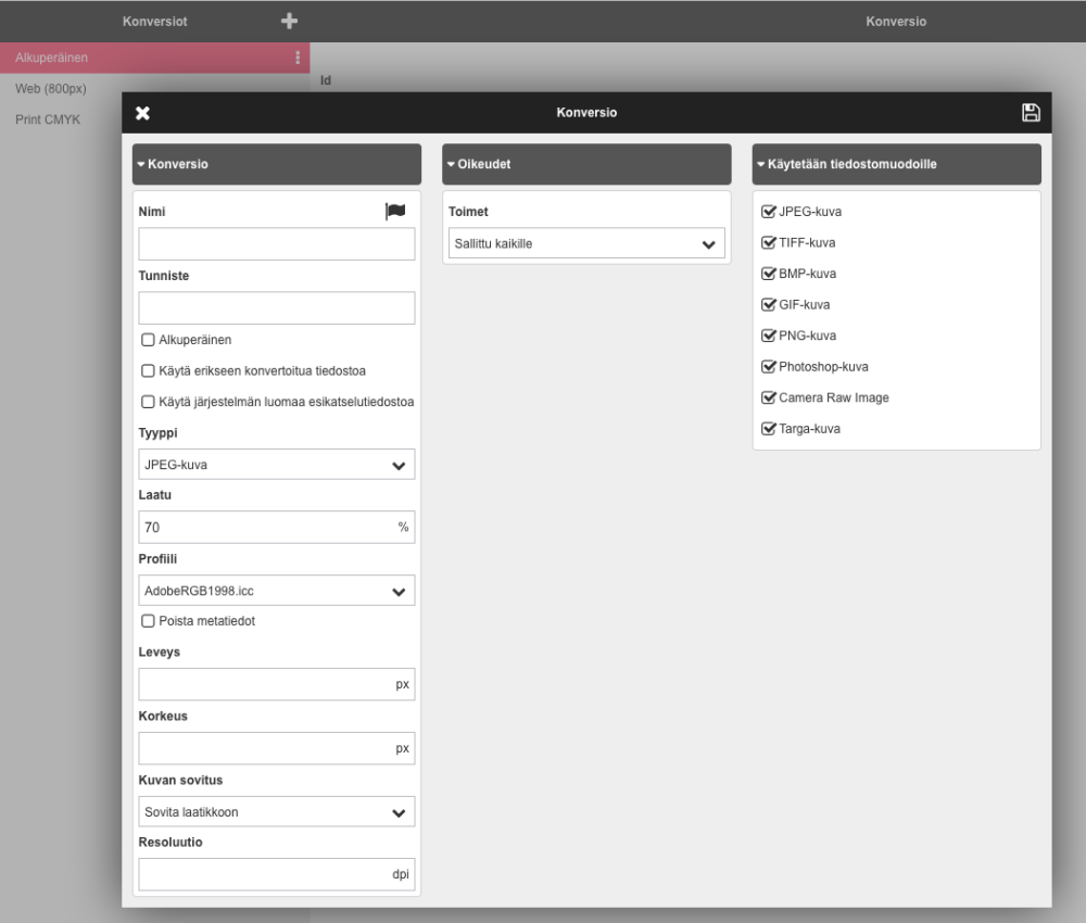 Avaa konversioasetukset, jossa määritellään kaikki konversiossa käytettävät asetukset, oikeudet, sekä käytettävät tiedostomuodot