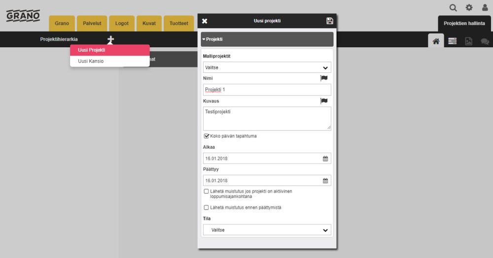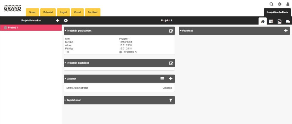 Projekti tulee näkyviin vasemmalle projektihiearkiaan. Projektin tietoja voidaan muokata ja tarkentaa luonnin jälkeen.