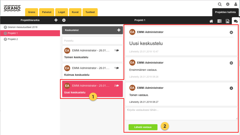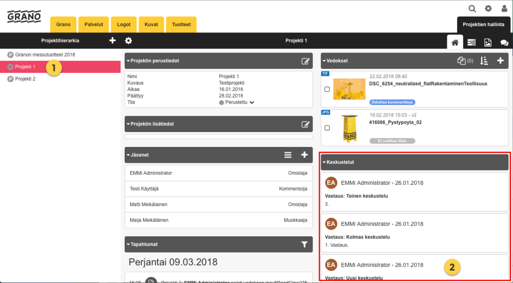 Projeketin kotinäkymässä näkyy ylimpänä uusimmat keskustelut ja keskustelut joihin viimeksi vastattu.
