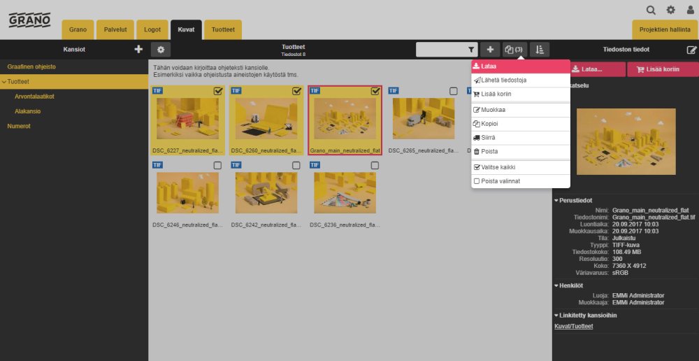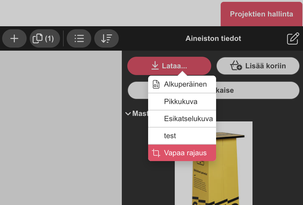 (Valinnat saadaan esille myös hiiren oikealla näppäimellä valittujen aineistojen kohdalla)