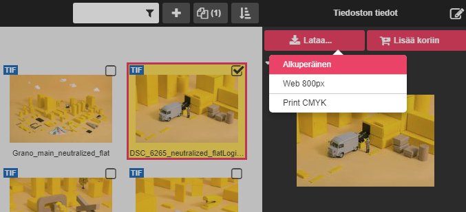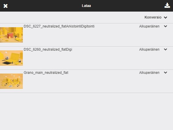 Latausvaiheessa voidaan kuitenkin ladata yksi tai useampi vaihtoehtoinen ennalta määritelty konversio esimerkiksi Web- tai Print (CMYK) -aineisto.