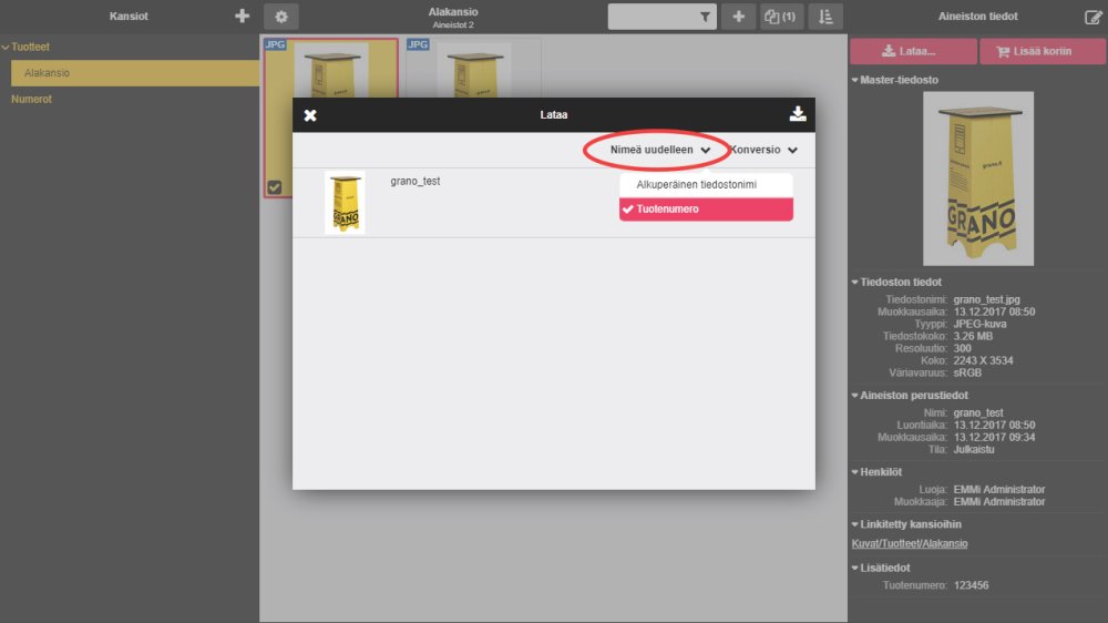 Tiedostojen latausvaiheessa voidaan valita ennalta määritetyistä vaihtoehdoista vaihtoehtoinen tapa nimetä tiedostot.