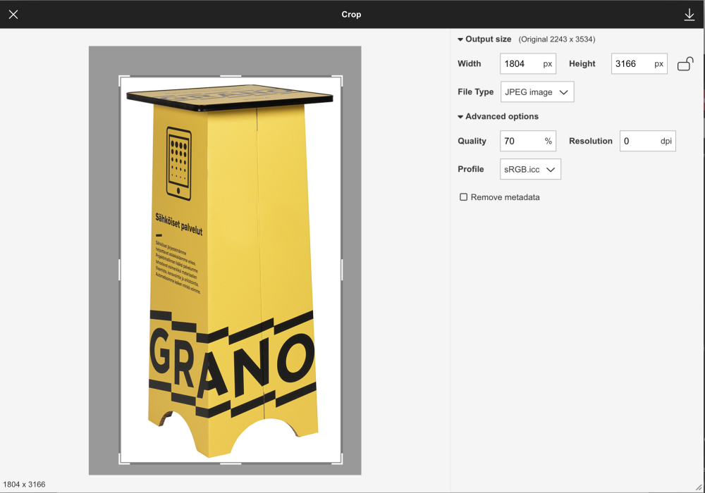 Lataa kuvatiedosto käyttäen vapaasti valittavaa kokoa ja kuvasuhdetta. Voit rajata kuvaa säilyttäen alkuperäisen kuvasuhteen tai avaamalla lukon ja rajaamalla kuvaa vapaasti kuten esimerkki kuvassa.