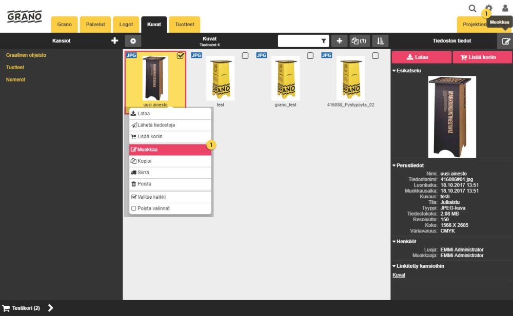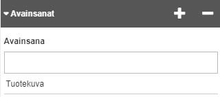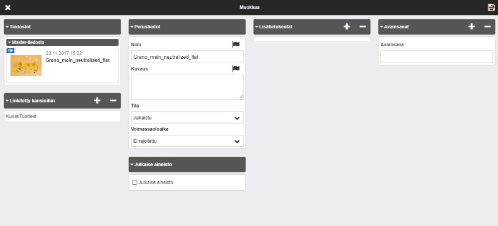 Voit lisätä aineistolle ennalta määriteltyjä avainsanoja, joilla voidaan parantaa aineistojen löydettävyyttä palvelun hakutyökalussa. Kuvan esimerkissä tiedosto saa avainsanan ”Tuotekuva”, joka tulee näkymään tallennuksen jälkeen aineiston ”Avainsanat”-paneelissa.