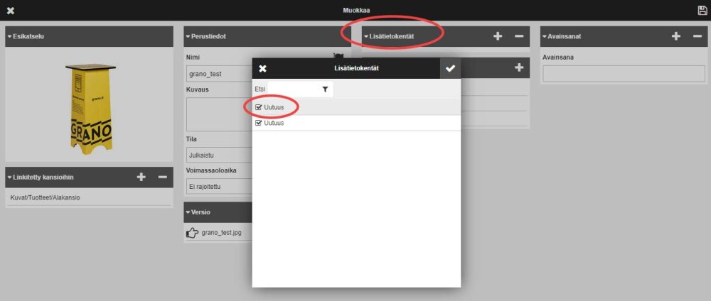 Aineistoille voidaan lisätä ennalta määriteltyjä lisätietokenttiä. Kuvan esimerkissä aineistolle lisätään kenttä: ”Uutuus”.
