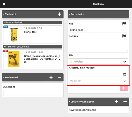 Aineiston tila voidaan ajastaa vaihtumaan toiseen tilaan tiettynä ajankohtana. Näin voidaan esim. estää aineistojen näkyminen osalle käyttäjistä joilla ei ole muokkausoikeuksia ainesitoon.