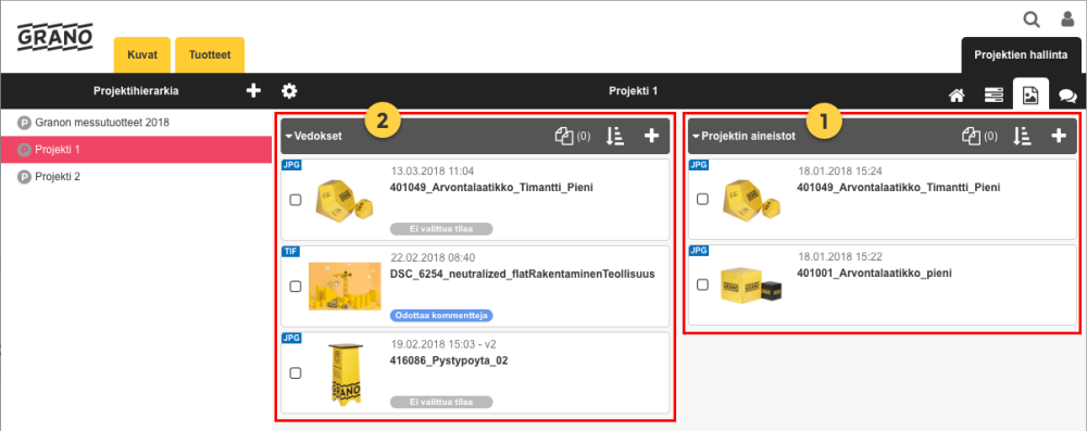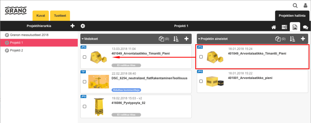 Projektiin voidaan liittää materiaaleja. Materiaaliesta voi tehdä vedoksia joita voi kommentoida. Materiaalien ja vedosten hallintaan vaikuttaa se millä roolilla käyttäjä on projektissa mukana. Rooliasetukset saattavat vaihdella palvelukohtaisesti. Oletuksena projektin omistaja sekä muokkaaja voivat lisätä projetktiin materiaaleja ja vedoksia.