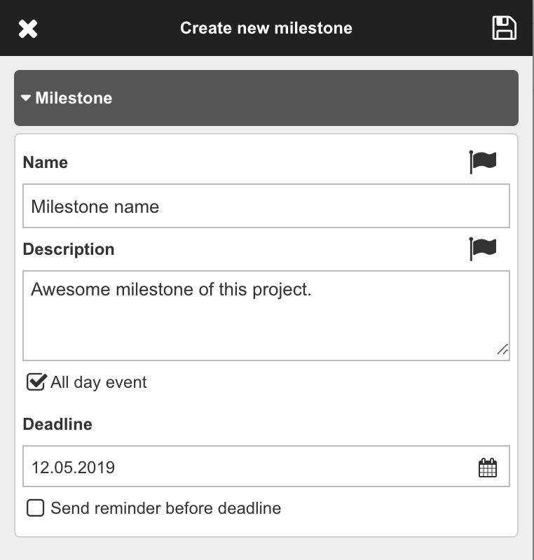 - Määräajan (poista ‘Koko päivän tapahtuma’ valinta jos haluat asettaa määräajalle myös kellonajan, muuten muistutusviestien lähettämisessä käytetään UTC 0:00 aikaa)