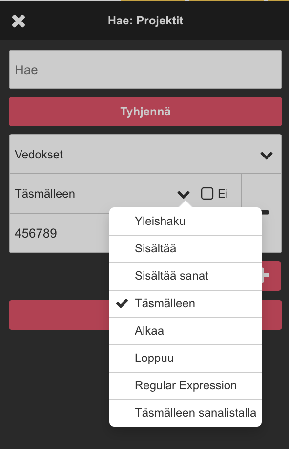 Suodata hakua ja kohdista haku esimerkiksi vain vedoksen nimeen. Esimerkissä haetaan vain vedoksia joiden nimi on täsmälleen “456789”.