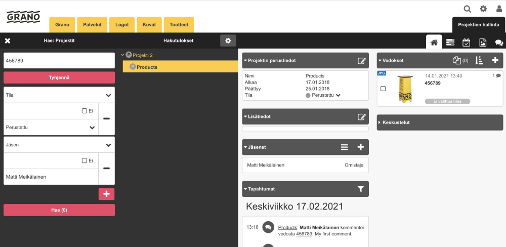 Haku palauttaa projektin Products jonka tila on Perustettu ja Jäsen Matti Meikäläinen, näiden lisäksi vedos nimeltä ‘456789’.