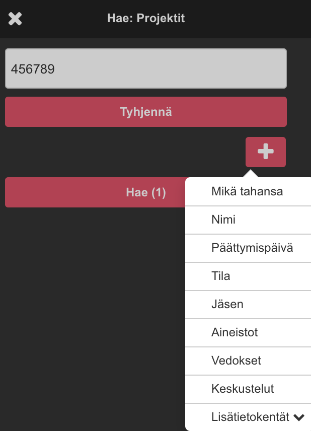 Tarkennettu haku hakee täsmälleen määritellystä luokituskentästä tai yhdistellä useita eri hakukenttiä. Hakukenttiä voi lisätä plus(+) painikkeesta ja poistaa miinus(-).