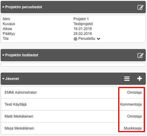 Projektilla käyttäjän oikeudet riippuvat valitusta roolista, jonka valitsee projektin omistaja. Projektijäsenten oletusroolit ja oikeudet: