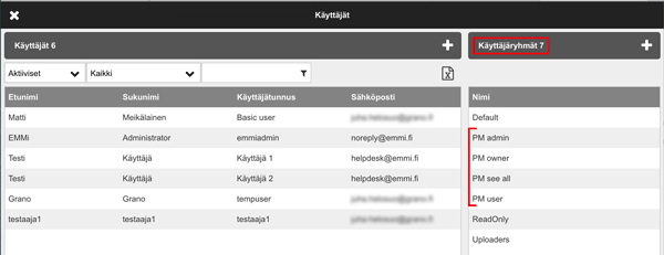 Palvelun pääkäyttäjä antaa käyttäjälle pääsyn projektinhallintaan lisäämällä hänet johonkin seuraavista käyttäjäryhmistä. Alla ryhmien oletusnimet palvelussa.