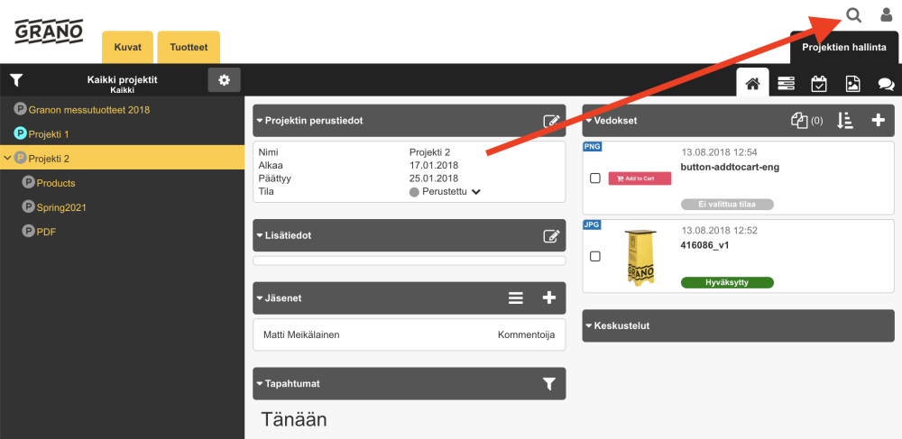 Esimerkissä hakusana: “456789” palauttaa projektin nimeltä Products, joka pitää sisällään vedoksen nimeltä 456789.