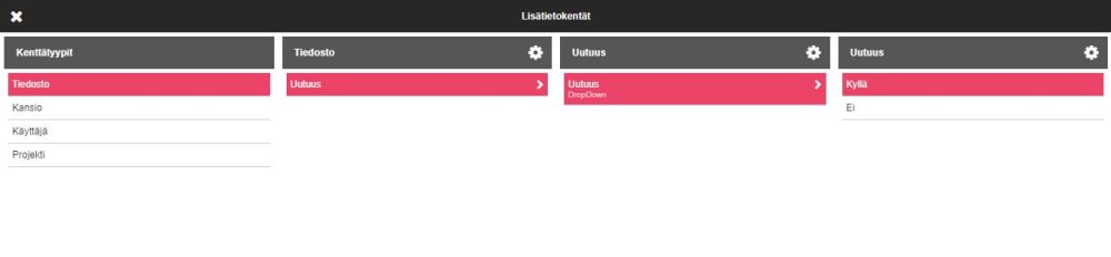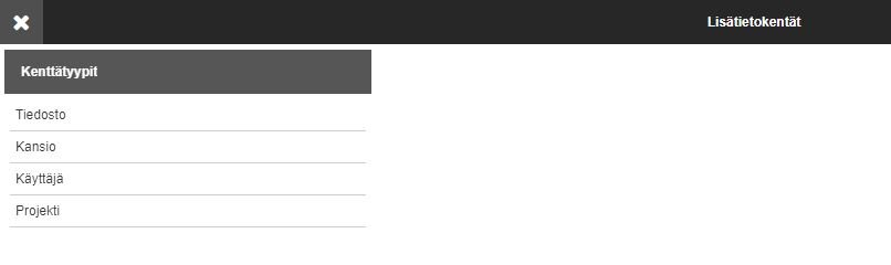 Lisätietokenttiä voidaan lisätä Tiedostolle, Kansiolle, Käyttäjälle tai Projektille.