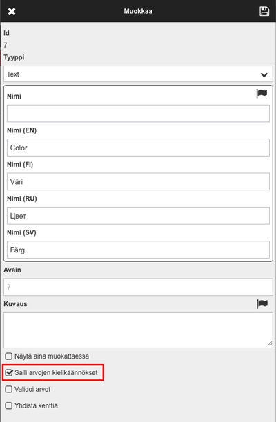 Lisätietokenttien asetukisissa arvoille voidaan asettaa omat kielikäännökset ruksimalla kohta “Salli arvojen kielikäännökset”. Esimerkissä lisätietokenttä “väri”.