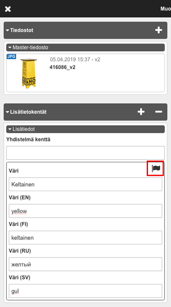Muokattaessa assettia ja lisättäessä assetille väri -lisätietokenttä, voidaan arvolle antaa oma kielikäännös.